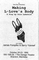 Making L-Love’s Body Co-produced with Brandon University Theatre. Brandon. 1999. Directors: James Forsythe and Barry Yzereef.